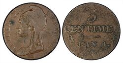 | 250px | 5 centimes | 23 mm | 1.4 mm | 5 g | Copper | Oblique reeded | Marianne; text "RÉPUBLIQUE FRANÇAISE", "Dupré" | Text "5 CENTIMES" | 1795 |