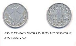 During the Nazi occupation of France (1940–1944), the franc was a satellite currency of the German Reichsmark. The exchange rate was 20 francs for 1 RM. The coins were changed, with the words Travail, famille, patrie (Work, Family, Fatherland) replacing the republican triad Liberté, égalité, fraternité (liberty, equality, fraternity), with the emblem of the Vichy regime added.