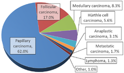 Thyroid cancers can be classified according to their histopathological characteristics.[30][31] These variants can be distinguished (distribution over various subtypes may show regional variation):