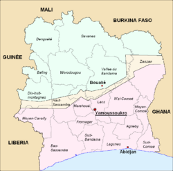 The town was repeatedly contested during the First Ivorian Civil War, which lasted from 2002 to 2004. Following the takeover of the town by the government on 16 October 2002, fifty civilians from the north were allegedly killed by government troops. Amnesty International described the killings as a "massacre", saying people in military uniform had killed people suspected of supporting the rebel Patriotic Movement of Côte d'Ivoire. The killings were allegedly based on their Muslim names or that the victims were nationals of Mali, Burkino Faso or Guinea. Côte d'Ivoire authorities ordered an inquiry but stated government forces had not been responsible.[4] However, no charges were brought and the Ouagadougou Peace Agreement in March 2007 between President Laurent Gbagbo and rebel leader Guillaume Soro incorporated a general amnesty for crimes committed in this time, except for crimes against humanity, war crimes and economic crimes.[5]