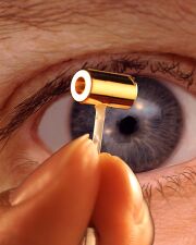 Mockup of a golden hohlraum used in laser inertial confinement.