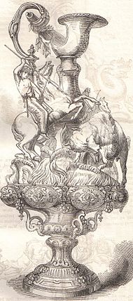 Edmund Cotterill was in charge of the design studio at Garrards in 1843 and at the time of the Empire Exhibition (1851) he was said to stand "at the head of the class of artists who model for silversmiths and his productions, annually exhibited at Messrs Garrard, have earned that house a celebrity which no other can equal".[5] The trophy is formed from modelled and cast silver components which were assembled together to create the final piece.[6]