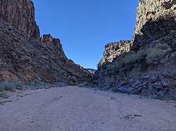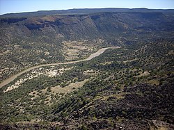 Caja del Rio Canyon (known locally as Diablo Canyon),[13] is a popular local rock climbing area on the northern section of Canada Ancha, near its confluence with the Rio Grande. This area can be accessed by Camino La Tierra and Old Buckman Road. Although the area is not marked, it has an undeveloped but very large parking area at its east end. The canyon walls include impressive trap rocks. The flat, sand bottom of the canyon is subject to spectacular flash floods during the summer monsoon season. The hike from Diablo Canyon to the Rio Grande is both scenic and easy White Rock Canyon. The wash is also popular with horse riders.[14] After passing Diablo Canyon, Old Buckman Road continues to the site of Buckman, a former logging town and depot of the narrow gauge Chili Line.[15] The Rio Grande can be forded in some seasons at Buckman. In fact, this crossing was a major transportation route between Santa Fe and the Pajarito Plateau.