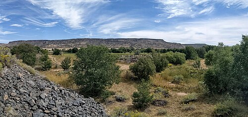 One of the scoria cones of the Caja del Rio, the Cienega volcano ( [ ⚑ ] 35°37′05″N 106°08′02″W / 35.618°N 106.134°W), has been quarried since 1919 for cinder. The quarry has exposed part of the deep plumbing of the volcano, which has been studied for clues to the nature of magmatic plumbing systems under cinder cones. The volcano itself has been radiometrically dated as 2.73 ± 0.06 million years old and erupted through three vents in at least two stages.[8]