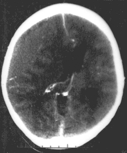 CT scan showing epidural hematoma, a type of traumatic brain injury (upper left)