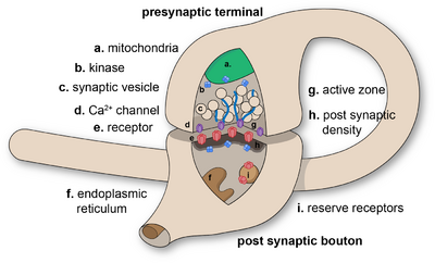 The synaptic cleft—also called synaptic gap—is a gap between the pre- and postsynaptic cells that is about 20 nm (0.02 μ) wide.[12] The small volume of the cleft allows neurotransmitter concentration to be raised and lowered rapidly.[13]
