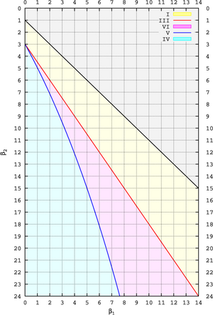 Rhind (1909, pp. 430–432) devised a simple way of visualizing the parameter space of the Pearson system, which was subsequently adopted by Pearson (1916, plate 1 and pp. 430ff., 448ff.). The Pearson types are characterized by two quantities, commonly referred to as β1 and β2. The first is the square of the skewness: β1 = γ1 where γ1 is the skewness, or third standardized moment. The second is the traditional kurtosis, or fourth standardized moment: β2 = γ2 + 3. (Modern treatments define kurtosis γ2 in terms of cumulants instead of moments, so that for a normal distribution we have γ2 = 0 and β2 = 3. Here we follow the historical precedent and use β2.) The diagram on the right shows which Pearson type a given concrete distribution (identified by a point (β1, β2)) belongs to.