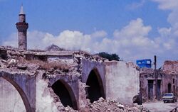 Damage from communal violence between Christian Greeks and Muslim Turks in Cyprus.