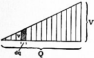 We have next to consider the energy storage which takes place when electric charge is created, i.e. when the dielectric is strained or polarized. Since the potential of a conductor is defined to be the work required to move a unit of positive electricity from the surface of the earth or from an infinite distance from all electricity to the surface of the conductor, it follows that the work done in putting a small charge dq into a conductor at a potential v is v dq. Let us then suppose that a conductor originally at zero potential has its potential raised by administering to it small successive doses of electricity dq. The first raises its potential to v, the second to v′ and so on, and the nth to V. Take any horizontal line and divide it into small elements of length each representing dq, and draw vertical lines representing the potentials v, v′, &c., and after each dose. Since the potential rises proportionately to the quantity in the conductor, the ends of these ordinates will lie on a straight line and define a triangle whose base line is a length equal to the total quantity Q and height a length equal to the final potential V. The element of work done in introducing the quantity of electricity dq at a potential v is represented by the element of area of this triangle (see fig. 4), and hence the work done in charging the conductor with quantity Q to final potential V is ½QV, or since Q = CV, where C is its capacity, the work done is represented by ½CV² or by ½Q² / C.