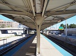 The Chicago Transit Authority's Blue Line, part of the Chicago 'L', runs through the median of the Eisenhower Expressway along the north side of the campus. Three Blue Line stations are close to the university: UIC-Halsted, Racine, and Illinois Medical District. The Pink Line serves UIC's west campus on Polk Street and runs directly to Ogilvie Transportation Center.