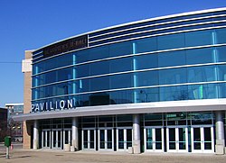 The East Campus was designed in the brutalist style by Walter Netsch.[62] The plan included second-story walkways that connected all of the buildings.[63] Some of the later buildings in Netsch's design were not rectilinear (the Behavioral Sciences Building) and even irregularly shaped (Science and Engineering South, and the never-completed Art & Architecture building). These demonstrated his idea of "field theory": designs which used squares and rotations of squares superimposed on one another. While the buildings are largely intact, the walkways were taken down in phases during the early 1990s to make the campus more welcoming.[64] Considerable effort has been expended to modify the original Netsch campus plan to create the feel of a traditional college campus. For example, the area in front of the main administration building, University Hall, has been the site of several renovations in the last decade; and, Credit Union 1 Arena (formerly the UIC Pavilion, a sports arena) was added in 1982.