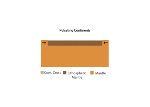In the pulsating continents model, differentiated, low density crust survives early global subduction events forming continental regions. These regions undergo compression due to heating from the surrounding mantle, forming the compressional features of tessera, such as fold and thrust belts, and basin dome terrain. After sufficient crustal thickening has occurred, new lithosphere is generated causing gravitational collapse, producing the extensional features of tessera, such as extensive grabens. During this collapse, decompression causes partial melting, producing the intratessera volcanism seen within the larger regions of tessera terrain. This model requires that the material comprising tessera terrain is continental in nature. Future missions to Venus to sample surface compositions are necessary to support this model.[9] This model does not currently explain how a global subduction event could cause the delamination of the entire mantle lithosphere, leaving only low density crust behind.