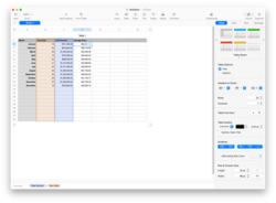 In contrast, Numbers does not have an underlying spreadsheet in the traditional sense but uses multiple individual tables for this purpose.[5] Tables are an X and Y collection of cells, like a sheet, but extend only to the limits of the data they hold. Each section of data or output from formulas can be combined into an existing table or placed into a new table. Tables can be collected by the user onto single or multiple canvases. Whereas a typical Excel sheet has data strewn across it, a Numbers canvas could build the same output through smaller individual tables encompassing the same data.[9]