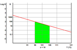 Example: if it takes an increase of 10 °C (18 °F) to move the curve one log, then our z-value is 10. Given a D-value of 4.5 minutes at 150 °C, the D-value can be calculated for 160 °C by reducing the time by 1 log. The new D-value for 160 °C given the z-value is 0.45 minutes. This means that each 10°C (18 °F) increase in temperature will reduce our D-value by 1 log. Conversely, a 10 °C (18 °F) decrease in temperature will increase our D-value by 1 log. So, the D-value for a temperature of 140 °C would be 45 minutes.