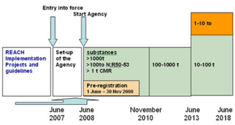The European Chemicals Agency has set three major deadlines for registration of chemicals. In general these are determined by tonnage manufactured or imported, with 1000 tonnes/a. being required to be registered by 1 December 2010, 100 tonnes/a. by 1 June 2013 and 1 tonne/a. by 1 June 2018.[5] In addition, chemicals of higher concern or toxicity also have to meet the 2010 deadline.
