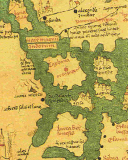 c. 1300. The Indian Ocean is depicted as a closed basin. The Golden Chersonese is the peninsula to the far east, just prior to the Great Gulf.