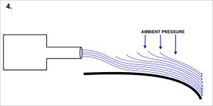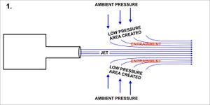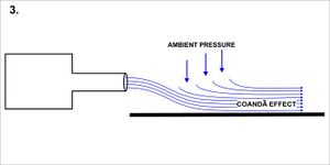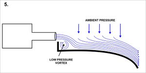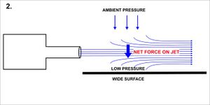 A free jet of air entrains molecules of air from its immediate surroundings causing an axisymmetrical "tube" or "sleeve" of low pressure around the jet (see Diagram 1). The resultant forces from this low pressure tube end up balancing any perpendicular flow instability, which stabilises the jet in a straight line. However, if a solid surface is placed close, and approximately parallel to the jet (Diagram 2), then the entrainment (and therefore removal) of air from between the solid surface and the jet causes a reduction in air pressure on that side of the jet that cannot be balanced as rapidly as the low pressure region on the "open" side of the jet. The pressure difference across the jet causes the jet to deviate towards the nearby surface, and then to adhere to it (Diagram 3).[7][8] The jet adheres even better to curved surfaces (Diagram 4), because each (infinitesimally small) incremental change in direction of the surface brings about the effects described for the initial bending of the jet towards the surface.[8][9] If the surface is not too sharply curved, the jet can, under the right circumstances, adhere to the surface even after flowing 180° around a cylindrically curved surface, and thus travel in a direction opposite to its initial direction. The forces that cause these changes in the direction of flow of the jet cause an equal and opposite force on the surface along which the jet flows.[8] These Coandă effect induced forces can be harnessed to cause lift and other forms of motion, depending on the orientation of the jet and the surface to which the jet adheres.[7] A small surface "lip" at the point where the jet starts to flow over that surface (Diagram 5) increases the initial deviation of the jet flow direction. This results from the fact that a low pressure vortex forms behind the lip, promoting the dip towards the surface.[7]