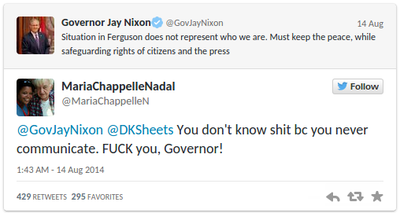 Violence continued on the evening of August 17, 2014, when peaceful daytime protesters turned markedly more violent after dark. Molotov cocktails and gunshots were fired in the direction of the highway patrol officers. Officers responded by firing tear gas into the crowd. Three more reporters were temporarily placed under arrest at the direction of Missouri Highway Patrol Captain Ron Johnson.[14] Governor Jay Nixon responded on August 18, 2014, by ordering the National Guard to Ferguson to help restore order.[15]