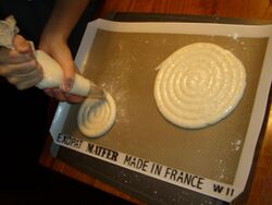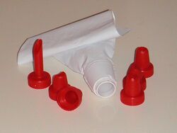 Interchangeable tips usually come in sets;[5] particular tips can often be purchased individually. They may be chrome-plated or stainless steel, or plastic. Each tip is cone-shaped, with a base too large to fit through the small opening in the bag; in some cases they are inserted through the larger opening before food is spooned in. If tips need to be interchanged without emptying the bag, they can be used with pairs of adapter rings: an inner ring is dropped inside the bag and pushed part way out the hole, a tip is slipped over the ring, then an outer ring is slipped over the tip and screwed onto the inner ring. Some inexpensive sets are of disposable plastic film with a drop-in ring and screw-on plastic tips (see image above). Many foods (including frosting and pressurized "spray can" whipped cream) can be purchased in disposable packaging designed to serve the function of a pastry bag.