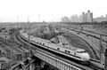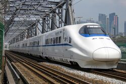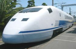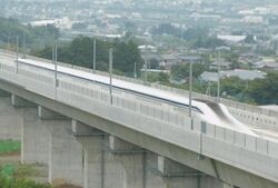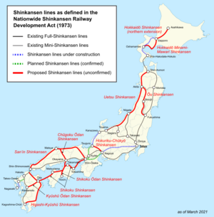 From Handwiki The Shinkansen (Japanese: 新幹線, ja, lit. new trunk line), colloquially known in English as the bullet train, is a network of high-speed railway lines in Japan. It was initially built to connect distant Japanese regions with Tokyo, the capital, to aid economic growth and development. Beyond long-distance travel, some sections around the largest metropolitan areas are used as a commuter rail network.[1][2] It is owned by the Japan Railway Construction, Transport and Technology Agency and operated by five Japan Railways Group companies.