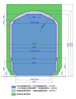 Shinkansen trains (excluding mini-Shinkansen) are also built to a larger loading gauge compared to conventional-speed rolling stock.[35] This larger loading gauge permits wider coaches, allowing for 5-abreast seating (2+3) in Standard Class coaches, compared to the more common 4-abreast (2+2) seating usually found elsewhere. On occasions, this wider loading gauge was also used to allow 6-abreast seating (3+3) on certain trains, such as the E1 and E4 series sets. This, combined with a lack of power cars, allows for a higher passenger capacity within a shorter train length. However, since mini-Shinkansen lines are effectively track-regauged conventional lines, the conventional loading gauge for 1,067mm lines still applies on mini-Shinkansen lines.