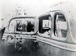 At approximately 9:00 A.M. on May 23 the posse, concealed in the bushes and almost ready to concede defeat, heard Clyde's stolen Ford approaching. The official report has Clyde stopping to speak with Henry Methvin's father, Ivan — planted there with his truck that morning to distract Clyde and force him into the lane closest to the posse — the lawmen opened fire, killing Bonnie and Clyde while shooting a combined total of approximately 130 rounds. By 9:15, the couple was dead. The duo had been hit by 50 or more rounds. The posse, under Hamer's direct orders, did not call out a warning,[31] or order the duo to surrender before firing. Clyde was killed instantly from Oakley's initial head shot. The officers emptied the specially-ordered automatic rifle, as well as rifles, shotguns and pistols at the car. According to Ted Hinton's and Bob Alcorn's statement to the Dallas Dispatch on May 24, 1934: "Each of us six officers had a shotgun and an automatic rifle and pistols. We opened fire with the automatic rifles. They were emptied before the car got even with us. Then we used shotguns …. There was smoke coming from the car, and it looked like it was on fire. After shooting the shotguns, we emptied the pistols at the car, which had passed us and ran into a ditch about 50 yards on down the road. It almost turned over. We kept shooting at the car even after it stopped. We weren't taking any chances."[32] Officers inspected the vehicle and discovered a small arsenal of weapons including stolen automatic rifles, semi-automatic shotguns, assorted handguns, and several thousand rounds of ammunition, along with 15 different license plates from various states and a saxophone that Clyde liked to play.