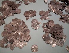 Of the 14,295 coins found, 14,200 were Islamic dirhams,[20] four were Nordic (from Hedeby), one was Byzantine and 23 were from Persia. The earliest, a Persian coin, dates from 539 and the latest from 870.[2] Many of the coins (as well as the bangles) had marks that may have been made when the purity of the silver was tested. There were several imitations and fakes among the coins. The illegal copies were made from good silver, but made in other places than where the originals were minted. All in all, 69 different minting locations from 15 present-day countries were identified in the hoard.[21]