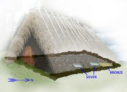 An extended survey and excavation revealed the foundations of a building and indicated that the hoards had been placed under the floorboards of what would probably have been a warehouse, shed or storage rather than a dwelling since it had no hearth. Carbon dating showed that the building had been in use between 540 and 1040.[8] The foundations and the remaining postholes indicated a regular Viking Age structure, about 10 by 15 m (33 by 49 ft) with a slanting sedge-covered roof, much like other similar finds on Gotland. It had been built on an older Iron Age foundation.[9]