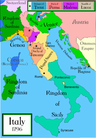 The armistice between Napoleon and the Duke of Modena was signed in May 1796, in Milan by San Romano Federico d'Este, representative of Duke Ercole III. France demanded 20 paintings from the Este Collection and a monetary sum triple that of the Parma armistice.[16]:440 The first shipment was sent by Giuseppe Maria Soli, director of the Accademia Atestina di Belle Arti (it).[25]