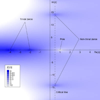 In mathematics, the Riemann hypothesis is the conjecture that the Riemann zeta function has its zeros only at the negative even integers and complex numbers with real part 1/2. Many consider it to be the most important unsolved problem in pure mathematics.[2] It is of great interest in number theory because it implies results about the distribution of prime numbers. It was proposed by Bernhard Riemann (1859), after whom it is named.