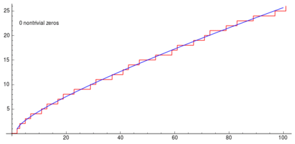 Riemann's explicit formula for the number of primes less than a given number states that, in terms of a sum over the zeros of the Riemann zeta function, the magnitude of the oscillations of primes around their expected position is controlled by the real parts of the zeros of the zeta function. In particular, the error term in the prime number theorem is closely related to the position of the zeros. For example, if β is the upper bound of the real parts of the zeros, then[4] [math]\displaystyle{ \pi(x) - \operatorname{li}(x) = O \left( x^{\beta} \log x \right) }[/math], where [math]\displaystyle{ \pi(x) }[/math] is the prime-counting function, [math]\displaystyle{ \operatorname{li}(x) }[/math] is the logarithmic integral function, [math]\displaystyle{ \log(x) }[/math] is the natural logarithm of x, and big O notation is used here. It is already known that 1/2 ≤ β ≤ 1.[5]