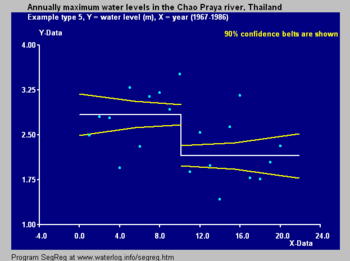 Segmented linear regression with two segments separated by a breakpoint can be useful to quantify an abrupt change of the response function (Yr) of a varying influential factor (x). The breakpoint can be interpreted as a critical, safe, or threshold value beyond or below which (un)desired effects occur. The breakpoint can be important in decision making [1]