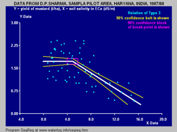 For the blue figure at the right that gives the relation between yield of mustard (Yr = Ym, t/ha) and soil salinity (x = Ss, expressed as electric conductivity of the soil solution EC in dS/m) it is found that:[3]