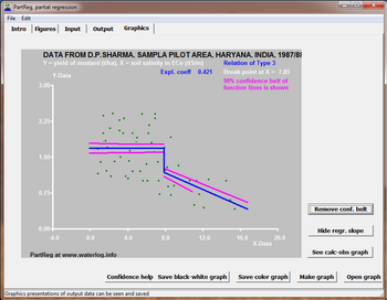 In the next figure the break point is found at X=7.9 while for the same data (see blue figure above for mustard yield), the least squares method yields a break point only at X=4.9. The latter value is lower, but the fit of the data beyond the break point is better. Hence, it will depend on the purpose of the analysis which method needs to be employed.