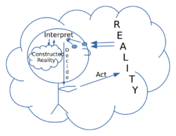 In the 16th century, Michel de Montaigne wrote that, "We need to interpret interpretations more than to interpret things."[13] In 1886 or 1887, Friedrich Nietzsche put it similarly: "Facts do not exist, only interpretations." In his 1922 book Public Opinion, Walter Lippmann said, "The real environment is altogether too big, too complex, and too fleeting for direct acquaintance" between people and their environment. Each person constructs a pseudo-environment that is a subjective, biased, and necessarily abridged mental image of the world, and to a degree, everyone's pseudo-environment is a fiction. People "live in the same world, but they think and feel in different ones."[14] Lippman's "environment" might be called "reality", and his "pseudo-environment" seems equivalent to what today is called "constructed reality".