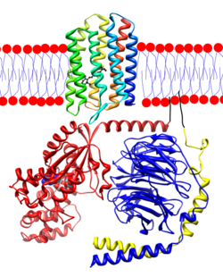 Animal GPCR rhodopsin (rainbow-colored) embedded in a lipid bilayer (heads red and tails blue) with transducin below it. G
