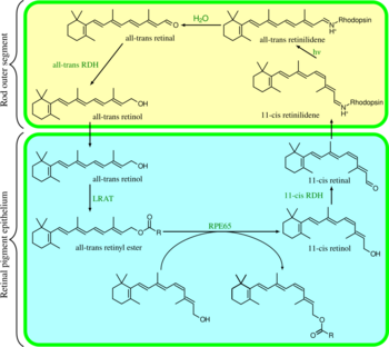 - ↑ Moiseyev, Gennadiy; Chen, Ying; Takahashi, Yusuke; Wu, Bill X.; Ma, Jian-xing (2005). "RPE65 is the isomerohydrolase in the retinoid visual cycle". Proceedings of the National Academy of Sciences 102 (35): 12413–12418. doi:10.1073/pnas.0503460102. PMID 16116091. Bibcode: 2005PNAS..10212413M.