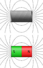 The magnetic field of a magnetic dipole is depicted in the figure. From outside, the ideal magnetic dipole is identical to that of an ideal electric dipole of the same strength. Unlike the electric dipole, a magnetic dipole is properly modeled as a current loop having a current I and an area a. Such a current loop has a magnetic moment of [math]\displaystyle{ m = Ia , }[/math] where the direction of m is perpendicular to the area of the loop and depends on the direction of the current using the right-hand rule. An ideal magnetic dipole is modeled as a real magnetic dipole whose area a has been reduced to zero and its current I increased to infinity such that the product m = Ia is finite. This model clarifies the connection between angular momentum and magnetic moment, which is the basis of the Einstein–de Haas effect rotation by magnetization and its inverse, the Barnett effect or magnetization by rotation.[17] Rotating the loop faster (in the same direction) increases the current and therefore the magnetic moment, for example.