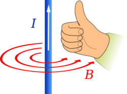 The magnetic field generated by a steady current I (a constant flow of electric charges, in which charge neither accumulates nor is depleted at any point)[note 8] is described by the Biot–Savart law:[20]:{{{1}}} [math]\displaystyle{ \mathbf{B} = \frac{\mu_0I}{4\pi}\int_{\mathrm{wire}}\frac{\mathrm{d}\boldsymbol{\ell} \times \mathbf{\hat r}}{r^2}, }[/math] where the integral sums over the wire length where vector dℓ is the vector line element with direction in the same sense as the current I, μ0 is the magnetic constant, r is the distance between the location of dℓ and the location where the magnetic field is calculated, and r̂ is a unit vector in the direction of r. For example, in the case of a sufficiently long, straight wire, this becomes: [math]\displaystyle{ |\mathbf{B}| = \frac{\mu_0}{2\pi r}I }[/math] where r = |r|. The direction is tangent to a circle perpendicular to the wire according to the right hand rule.[20]:{{{1}}}