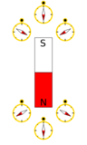 The field at the surface of the Earth is approximately the same as if a giant bar magnet were positioned at the center of the Earth and tilted at an angle of about 11° off the rotational axis of the Earth (see the figure).[44] The north pole of a magnetic compass needle points roughly north, toward the North Magnetic Pole. However, because a magnetic pole is attracted to its opposite, the North Magnetic Pole is actually the south pole of the geomagnetic field. This confusion in terminology arises because the pole of a magnet is defined by the geographical direction it points.[45]