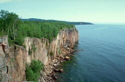 The North Shore Highlands are part of what once was called the Cabotian Mountains, a name applied to the highlands north of Lake Superior.[1] They are bounded on the south by the North Shore of Lake Superior, from which they rise in rock formations ranging from gentle slopes to sheer cliffs. They extend from the Dalles of the Saint Louis River in Jay Cooke State Park on the west near Thomson, Minnesota, to the Grand Portage Highlands in the Grand Portage Indian Reservation at the easternmost extremity of the state.[2] Between these anchors are cliffs along the shore such as Silver Creek Cliff, Split Rock, Palisade Head, and Shovel Point; the Sawtooth Range, also lakeside in the central part of the uplands; and the inland Misquah Hills to the east, containing Eagle Mountain, the highest point in Minnesota.