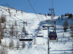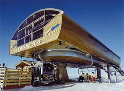 In Verbier, Switzerland , lift manufacturer Leitner Ropeways installed a hybrid lift, "La Chaux Express", in 2005. The 20 cabins, manufactured by CWA, each hold 8 passengers whilst the 60 chairlifts can each hold up to 6. The result is a maximum capacity of 1950 to 2400 persons per hour.[6] The lift also has multiple stations; the valley station at 2200 m, and the middle at 2484 m which angles the route of the lift, allowing the second lower station at 2260 m.[7] The middle station is most commonly disembarked during the ski season as it lies in the "middle" of the slopes. This provides a connection for skiers not willing to ascend entirely, for instance, to the Col des Gentianes (2950 m).