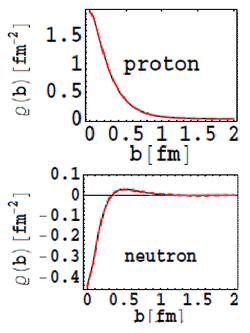 The proton and neutron transverse charge distributions, \(\rho_{\perp}\ ,\) versus the impact parameter \(b\) in femtometers, in the light front frame as calculated in a model independent approach by Miller (2007), are shown in Figure 11. Most noticeable are the negative transverse charge densities at the center and for large distances for the neutron, which contradict the early ideas about a negative pion cloud surrounding a positively charged core.