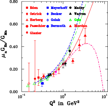The electric form factor of the neutron has also recently been measured to \(Q^2\)-values well in excess of 1 \(GeV^2\ .\) Ten years ago two experiments were undertaken using a polarized \(^2H\) target, and with an un-polarized liquid \(^2H\) target and a polarimeter. Most recently a beam-target asymmetry experiment with a polarized \(^3He\)-gas target was done at JLab, reaching a \(Q^2\) of 3.5 \(GeV^2\ .\) In such a target optical pumping polarizes \(^{85,87}Rb\ ,\) and the polarization is transferred to \(^3He\) through collision; the latest improvement, using a second alkali (\(Na\)) to boost the spin transfer resulted in steady, in-beam polarizations of \(\sim 55\%\) up to 10\(\mu A\) electron beam current. The results of all \(G_{En}\) measurements are seen in Figure 9; except for the results from the last experiment, shown as red, filled triangles. Note that at \(Q^2~=~3.5~ GeV^2\ ,\) \(G_{En}/G_D\) reaches nearly the same value as \(G_{Ep}/G_D\) at that same \(Q^2\) (see Figure 3). Yet the neutron is neutral!