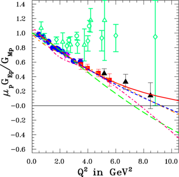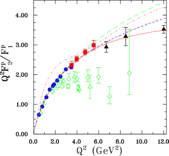 Perturbative QCD is only valid at very large momentum transfers. In this limit, the virtual photon makes a hard collision with a single valence quark, which then shares the transferred momentum with the other two, nearly collinear quarks through two gluon exchanges. The nucleon electromagnetic form factors provide a famous test for perturbative QCD. Brodsky and Farrar (1975) derived scaling rules for the dominant helicity amplitudes with the expectation that \(Q^2 F_{2p}/F_{1p}\) should become constant at sufficiently high momentum transfers \(Q^2\ .\) The original pQCD prediction has been modified by Belitsky, Ji, and Yuan (2003). These authors questioned the quark co-linearity assumption at the basis of this prediction. They showed that including quark orbital angular momentum resulted in a logarithmic rise of the \(Q^2 F_2/F_1\)-ratio at large \(Q^2\ .\)