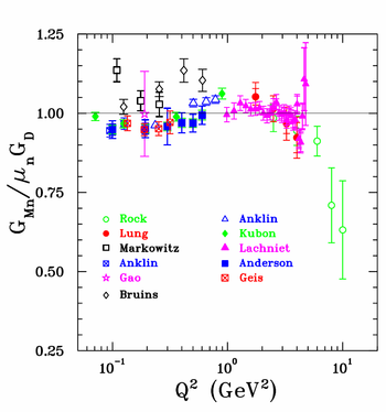 Most experiments that determine \(G_{Mn}\) are cross section measurements and are shown in Figure 10. The large \(Q^2\) coverage achieved recently in the CLAS detector resulted from a simultaneous detection of \(^2H(e,e'p)'\) and \(^2H(e,e'n)\) events (the ratio method) as well as \(^1H(e,e'p)\) for efficiency monitoring.
