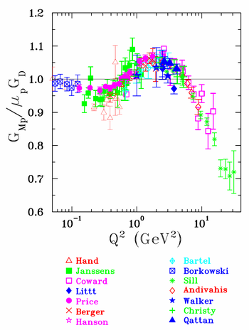 All form factors obtained from cross section measurements for the proton, \(G_{Ep}\) and \(G_{Mp}\) are shown in Figure 3 and Figure 4; they have been divided by the dipole form factor \(G_D\ .\) Evidently the form factors divided by \(G_D\) appear to remain close to \(1\ .\) This behavior suggested that \(G_{Ep}\ ,\) and \(G_{Mp}\) have similar spatial distributions, and this was the paradigm, until the double polarization experiments at the Thomas Jefferson National Accelerator Facility in Virginia (for short JLab) showed that it was not the case.