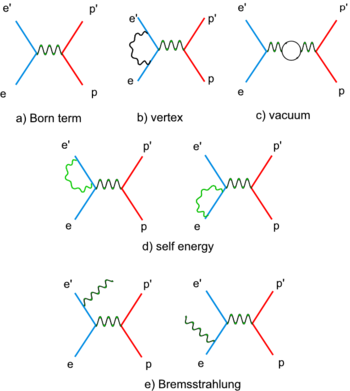 Underlying the interpretation of all \(ep\) cross section measurements over half a century, has been the concept that elastic electron nucleon scattering can be described in terms of a one photon exchange process (OPEX). However cross section data must first be corrected for radiative effects, which are multiple photon effects. In first order approximation these corrections include bremsstrahlung by the incident and scattered electron and by the recoiling proton, as well as vertex photon exchange, self-energy and vacuum polarization. An explicit two photon exchange contribution, which traditionally has been evaluated only in the phase space region where one of the two photons has very small energy, is also included. Figure 2 shows several internal radiative correction diagrams involving the electron, there are similar diagrams also for the proton.