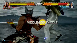 With a new display system, the game's multiplayer allows players to choose which side of the screen to play on.[8] Movement has undergone some changes and is similar to the movement mechanics found in Tekken Revolution, most notably when characters walk backwards. The arcade version features the traditional stage-based playthrough, in which the player progresses by beating five different opponents one by one, ending with a fixed penultimate and final stage. Matches may be interrupted if another player joins the game. Online mode is available for both local and international play. Character customization is featured, allowing the player to modify characters' appearances.[9] For the first time in the arcade series, the game features a practice mode, which allows players to train moves against an opponent for a limited amount of time, as well as an option to collect in-game rewards, mainly customization items, through "Treasure Box" by winning enough matches.