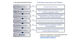 From Handwiki Scenario analysis is a process of analyzing future events by considering alternative possible outcomes (sometimes called "alternative worlds"). Thus, scenario analysis, which is one of the main forms of projection, does not try to show one exact picture of the future. Instead, it presents several alternative future developments. Consequently, a scope of possible future outcomes is observable. Not only are the outcomes observable, also the development paths leading to the outcomes. In contrast to prognoses, the scenario analysis is not based on extrapolation of the past or the extension of past trends. It does not rely on historical data and does not expect past observations to remain valid in the future. Instead, it tries to consider possible developments and turning points, which may only be connected to the past. In short, several scenarios are fleshed out in a scenario analysis to show possible future outcomes. Each scenario normally combines optimistic, pessimistic, and more and less probable developments. However, all aspects of scenarios should be plausible. Although highly discussed, experience has shown that around three scenarios are most appropriate for further discussion and selection. More scenarios risks making the analysis overly complicated.[1][2] Scenarios are often confused with other tools and approaches to planning. The flowchart to the right provides a process for classifying a phenomenon as a scenario in the intuitive logics tradition.[3]